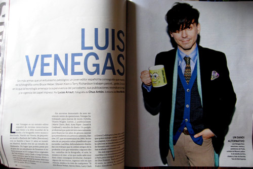 Pero la estrella de la edición no es ninguna de las múltiples páginas dedicadas a reseñar tendencias de temporada, accesorios imprescindibles y looks para imitar. Lo mejor son las seis páginas de entrevista a Luis Venegas, una persona conocida entre la nueva movida madrileña (lo que el blogger Popy Blasco, creador de los eventos Cineshock, define como «generación postwindsor»), editor de fanzines, promotor de fiestas y deejay divertido que responde con una honestidad brutal a las preguntas del periodista. Hacía tiempo que no leía una entrevista tan interesante sobre temas tan superficiales. Venegas dice que consigue trabajos gratuitos de fotógrafos que son lo más, como Terry Richardson o Bruce Weber, y no les importa aparecer junto a autores desconocidos porque «es como cuando haces una fiesta y mezclas a ricos con modernos, a ambos les gusta estar en compañía de los otros».