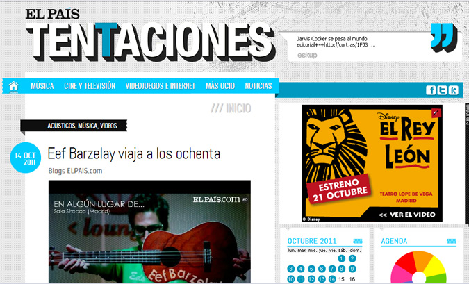Y poco antes de entrar a la universidad, los viernes se convirtieron en lo que ya son hoy; un día de eventos vespertinos, inauguraciones de exposiciones y tiendas. Venían aliñados con una iniciativa periodística que copó toda mi atención desde que la descubrí: el suplemento Tentaciones de El País. Todavía recuerdo la fuerza de aquella cabecera de color en Futura Sans Serif, con grandes fotos de grupos que no conocía y que hoy son mis referentes. Disfrutaba el el tren todos los viernes leyendo sus sección de sexo, reseñas musicales y vanguardia informativa: una forma diferente de contar un mundo paralelo, que es en el que vivo sumergido. Eso que algunos todavía llaman indie.