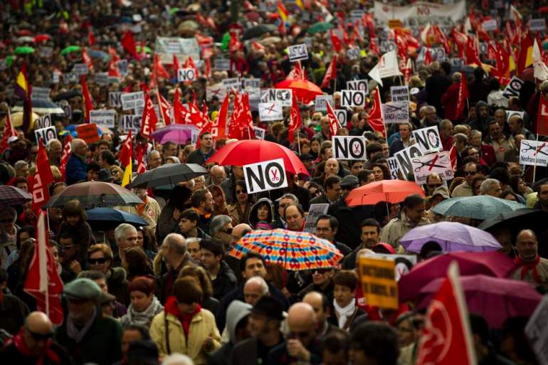 En España, el presidente Mariano Rajoy ha subido las matrículas universitarias, ha recortado becas, ha bajado el sueldo a los profesores (que ahora amplían el ratio de alumnos por aula) y prevé eliminar universidades porque «hay muchas». Además, establece el copago sanitario en medicamentos, tratamientos, intervenciones quirúrgicas y servicios de transporte sanitario. Y pese a todo, sube el IRPF especialmente en los tramos que afectan a la clase media, sube el IBI y dinamita el consumo familiar. Medidas para atajar el desempleo: ninguna. Medidas para crear desempleo: todas. Son motivos más que de sobra para salir a la calle el Día del Trabajador a manifestarse.